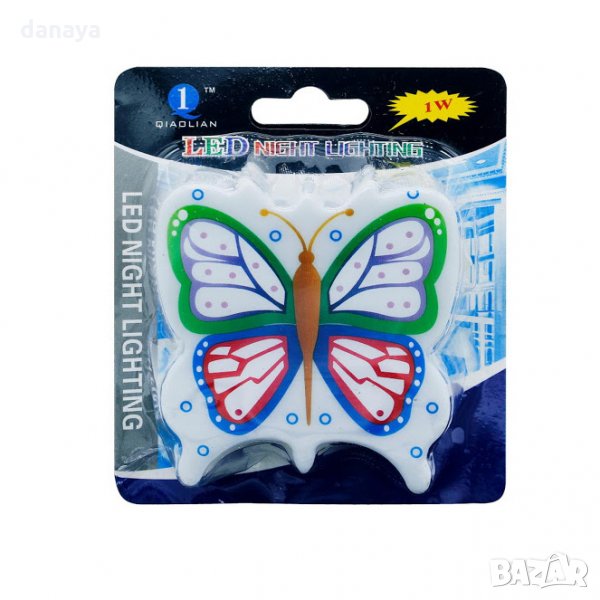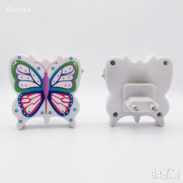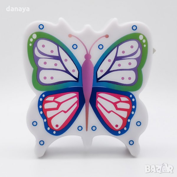 Енергоспестяваща нощна лед лампа за стена с копче за включване и изключване. Лед лампа за контакт с форма на пеперудка с шарени криле. Симпатична нощна лед лампичка, идеална за всяко детско помещение. Специално разработена, за да пести електроенергия.