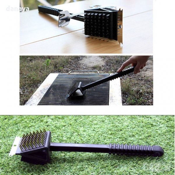 Четка за почистване на барбекю. 3 в 1 комбинирана четка с дълга дръжка за почистване на скари.. Четка за грил с гъба и шпатула, подходяща за почистване на барбекюта, грилове, скари, фурни, котлони и др. Стабилната дълга дръжка дава отлична опора и я превръща в незаменим помощник, с който лесно ще почиствате застояли и загорели повърхности.
