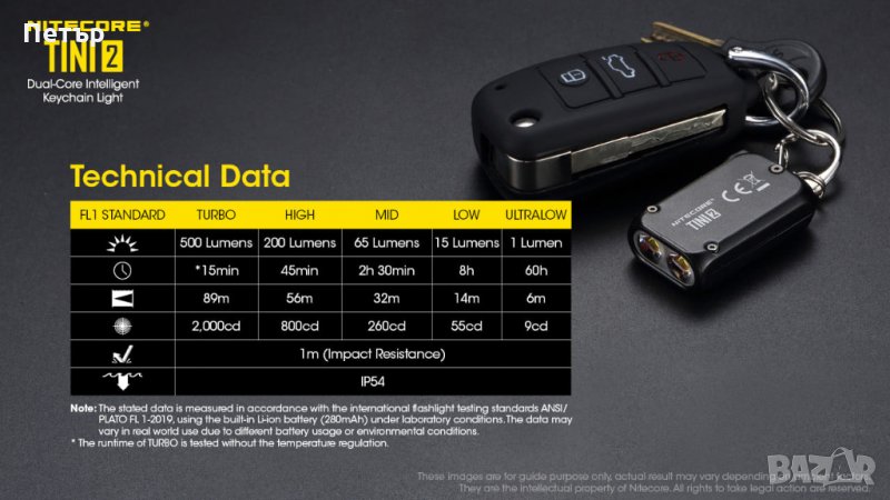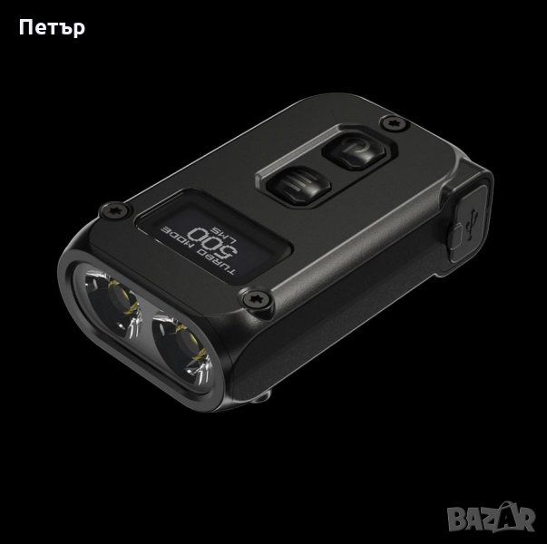 15 лумена съответно 2 часа и половина и 8 часа. Турбо режима от 500 лумена е наличен разбира се когато се налага и се включва със задържане на единия от двата бутона за управление на фенерчето. Ключодържателя има вградена литиево-йонна батерия 280mAh която се зарежда от USB-C порт в корпуса на фенерчето. Има два режима на заключване, като самото фенерче е изключително мощно и практично за размерите си. Изработено е изключително качествено и здраво от алуминиева сплав. Водоустойчив рейтинг IP54. Това е едно от най - малките и мощни подобни мини фенерчета. А марката Nitecore може да се каже че е една от най - иновативната специално в такива нестандартни решения, и не само.