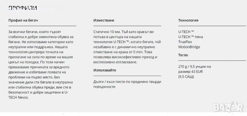 U-TECH Nevos е иновативна обувка за бягане, която свежда до минимум неправилните движения по време на бягане. В конвенционалните маратонки често неправилните движения са причинени от стърчащи подметки и здрави, поддържащи елементи. Не така е с U-TECH Nevos. Технологията U-TECH ™, вдъхновена от формата и функцията на човешкото стъпало, се състои от новоразработена TPU пяна в емблематична U-форма. U-TECH ™ центрира точката на прилагане на сила за всеки бегач по надлъжната ос на стъпалото, така че вредният въртящ момент - особено на коляното - да бъде сведен до минимум. По този начин U-TECH Nevos се занимава с причината за небиологичното движение и не позволява да възникнат проблеми. Вече не са необходими остарели категории като неутрални или стабилни, които лекуват само симптоми. В същото време се подобряват производителността и комфортът. Най-новите научни открития и изцяло ново усещане за бягане са съчетани в уникална на пазара обувка за бягане.