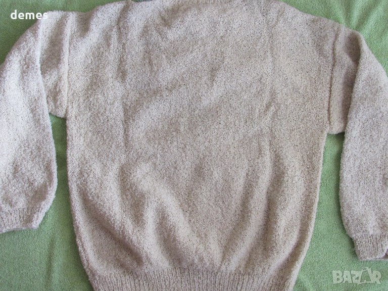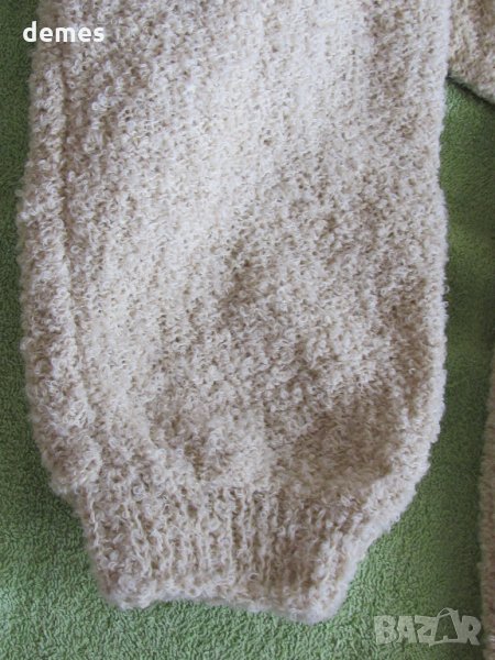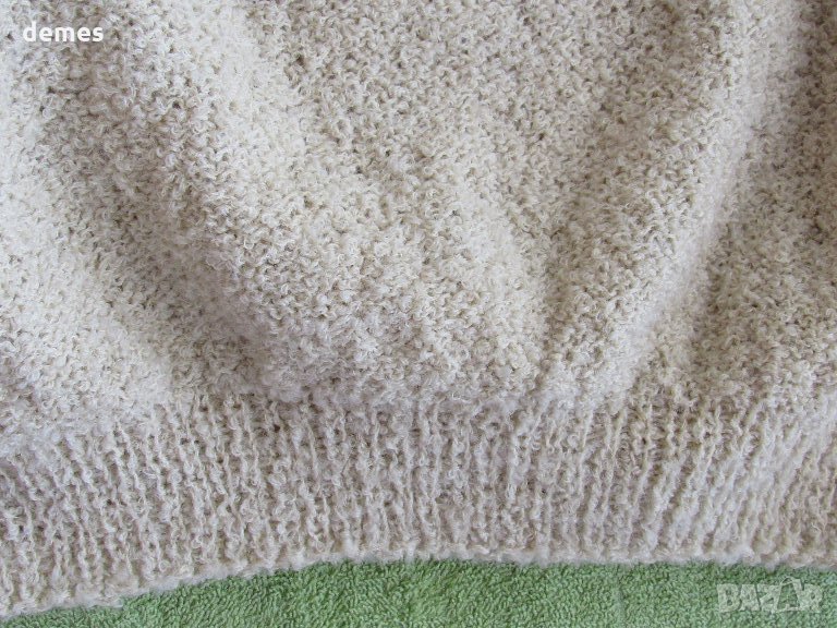 Блузата е ръчно плетена от букле в цвят шампанско.