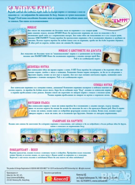 Сладките и готини мишки църкат, докато вдигате картички със сирене с вендузите на носовете им! Потърсете в кои карти със сирене има мишки от вашия цвят и ги съберете в една дълга редица. Но се пазете от котката! Играта приключва, когато пъзела с котката е завършен. Който събере най-много мишки от своя цвят, печели.