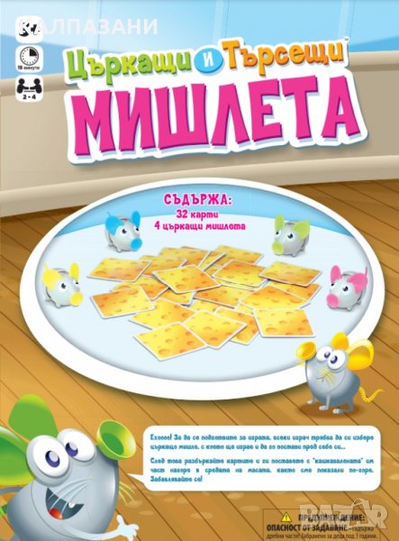 Играта съдържа 32 карти и 4 мишлета.