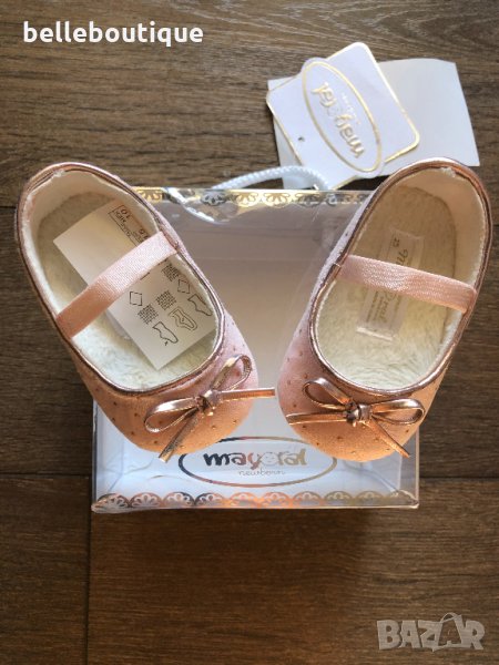Страхотни бебешки буйки за новородена принцеса Майорал Mayoral 15 номер. Цвят - бледорозов. Размер на стелката- 9 см. Опаковани са в красива кутия. Изключително удобни и лесни за обуване. Идеално се съчетават с роклички и панталони.
