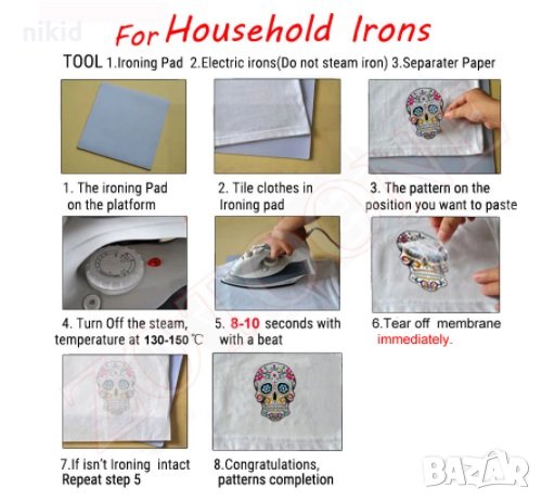 Поставете върху желана дреха -БЕЗ да премахвате защитно фолио , покрийте с парче плат,след което с топла ютия 120-150 градуса за 10-15 секунди минете отгоре ,след което отлепете защитното фолио.