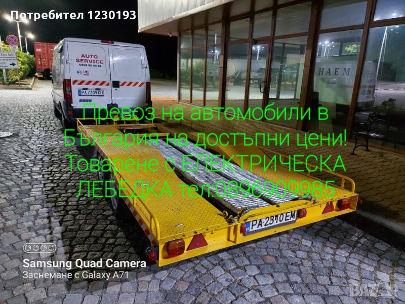 Превоз на автомобили с платформа в България и Чужбина на приемливи цени! *Превоз на автомобила ви във всяка една точка на страната и чужбина! >>>Товарене и разтоварване с електрическа лебедка от 13000lb и прецизна работа с нея! Обезопасяване с подходящи колани! Товарене на всякакъв вид автомобили! Товарене на разглобени,катастрофирали и нерегистрирани автомобили! Помощ на пътя, като подаване на ток, Авто сервизни ремонти,авто диагностика и отстраняване на други проблеми Имам колички за пътна помощ при блокирала ръчна спирачка,блокирали колела и автомобили без сходимост с проблеми с придвижването. За гр.Пазарджик и околността предлагам бързо отзоваване на товарния адрес 24часа в денонощието 7дни в седмицата на тел.089 690 9985
