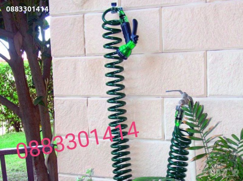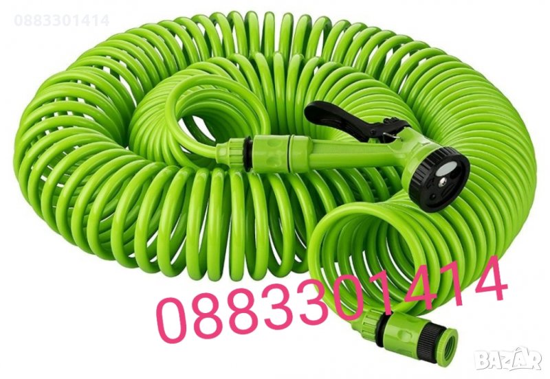 маркуч тип спирала в светло зелен цвят с пистолет за регулиране на водната струя.