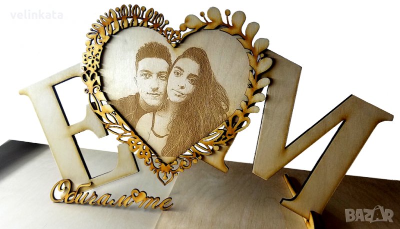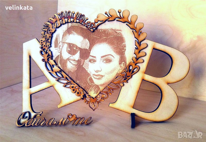 - Голямо Дървено Сърце с Вашите Инициали, гравирана снимка, рамка цветя и 3D надпис "ОбичамТе" или подобен надпис- Цена - 54лв./27,65€