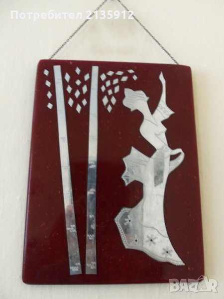 2.Декоративна картина, изобразяваща брезичка и танцуваща девойка.Размери 23 - 18 см. Окачва се на метално синджирче. 6 €.