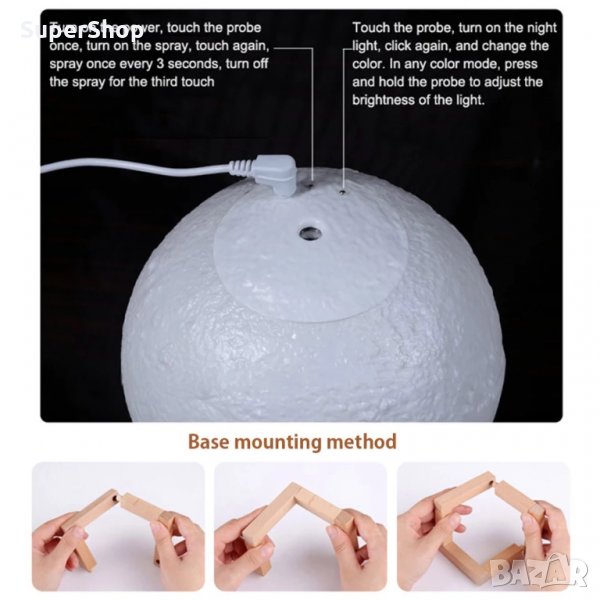 Красив и функционален арома дифузер, който внася неповторима атмосфера във всяко помещение! Арома дифузерът е с 3D релефна форма на луна и може да се използва като нощна лампа. Той овлажнява въздуха и впръсква терапевтични аромати на етерични масла в стаята. С арома дифузер Луна подаряваш емоция, здраве и уют в дома!
