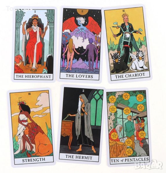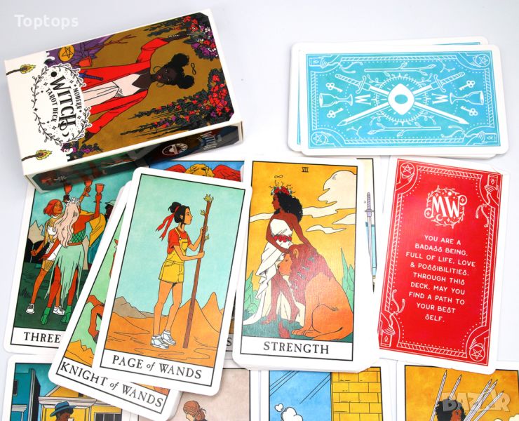 - 78 таро карти - Modern Witch Tarot с пдф файл с инструкции на английски. Размерът им е 10,5см х 6,3см, колодата е създадена от Lisa Sterle.