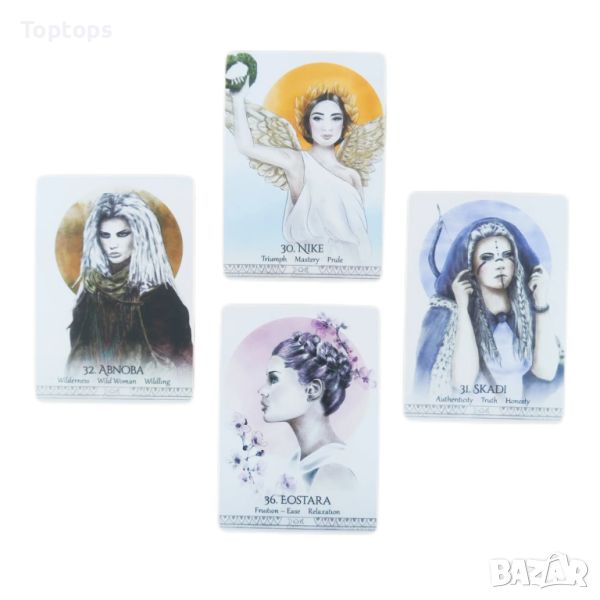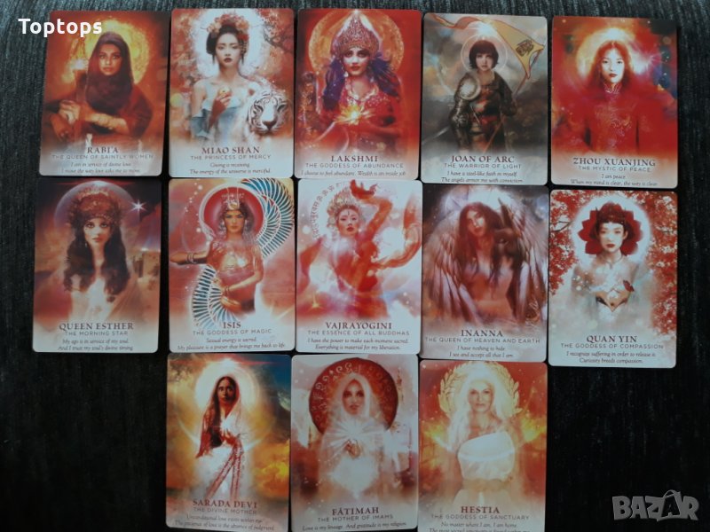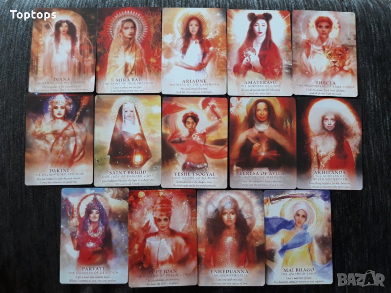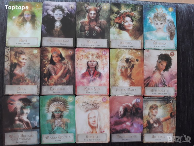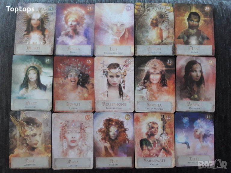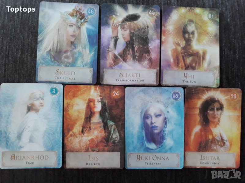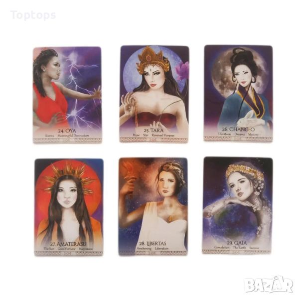 - 52 оракул карти - Goddess Power Oracle заедно с pdf файл с инструкции на английски. Размерът им е 10,3см х 7,5см, колодата е създадена от Colette Baron-Reid.