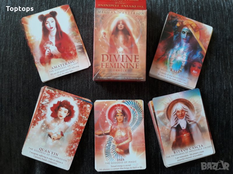 - 53 оракул карти - The Divine Feminine Oracle заедно с pdf файл с инструкции на английски. Размерът им е 10,3см х 7,5см, колодата е създадена от Meggan Watterson.