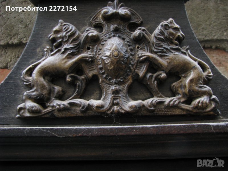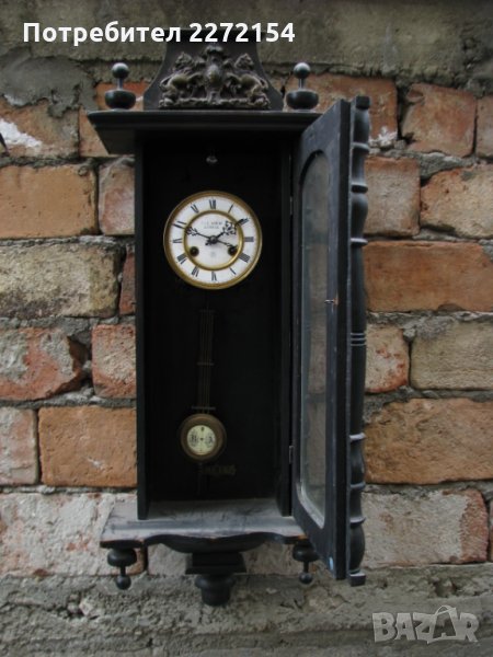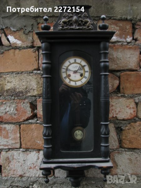 Ръчно изработен в Германия между 1880 и 1890г. С порцеланов циферблат и махало.Махалото му се движи с плавен и къс ход,часовника работи точно без да спира и почти безшумно.Има силен гонг/звънене.С оригинален ключ.Черна дървена кутия,дърворезбована с височина 88см,ширина 36см. За друг град изпращам по Еконт след като получа 30лв капаро .