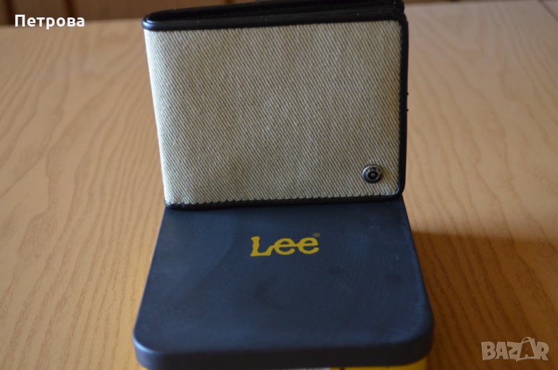 Портфейла е чисто нов и в оригиналната си метална кутия, а моделът е Billfold W/ID Security Wallet. Оригинален на Американската фирма Lee. Портфейлът е хоризонтален тип и е изработен в комбинация от плат и изкуствена кожа или: