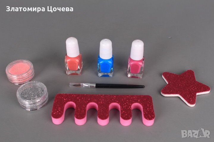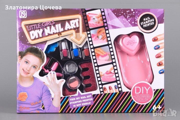 Комплектът съдържа 3 лака за нокти, 2 броката, принтер-печат за картинки, шаблон за картинките, разделител за пръсти, двустранна пила, шпатулка, четка, лепило и комплект изкуствени нокти.