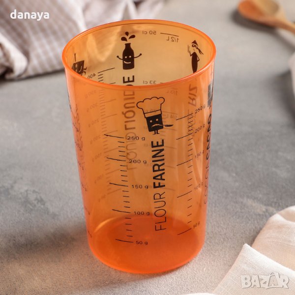 Кухненска мерителна чаша, прозрачна. Измерва в грамажи и литри. Чашата има деления за течности, захар, брашно, какао и ориз. Отлична за лесно и точно отмерване на течности и насипни продукти. Чашата се предлага в различни цветове.