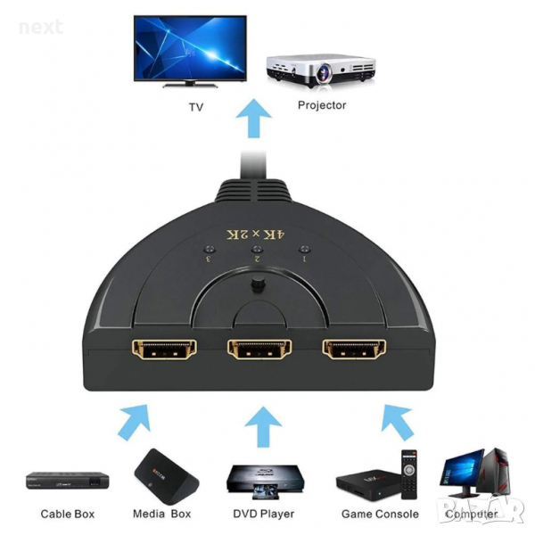 + Служи за включване до 3 устройства едновременно към един приемник за визуализиране на видео-аудио сигнал (TV, монитор, проектор и др.) като се използва само един HDMI вход на устройство.