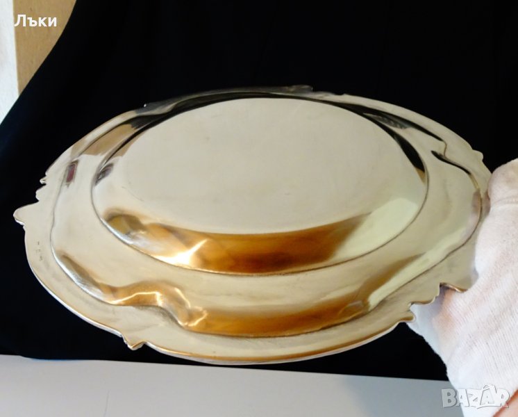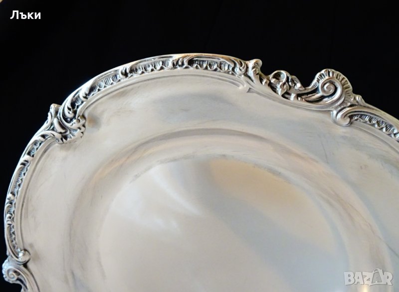 калай и 5% сребро,маркирано.По края платото има най-красивите барокови орнаменти изваяни с отчетлив прецизен релеф.Диаметър 30 см.,височина 2.5 см.,тегло 890 гр.