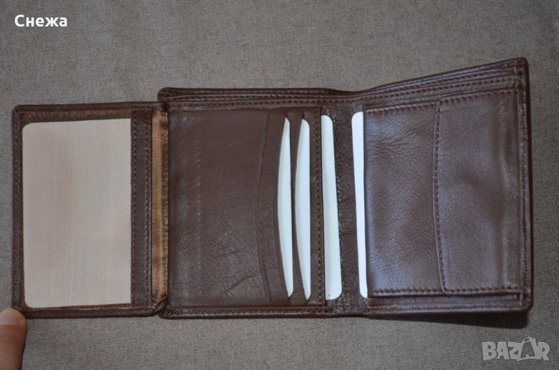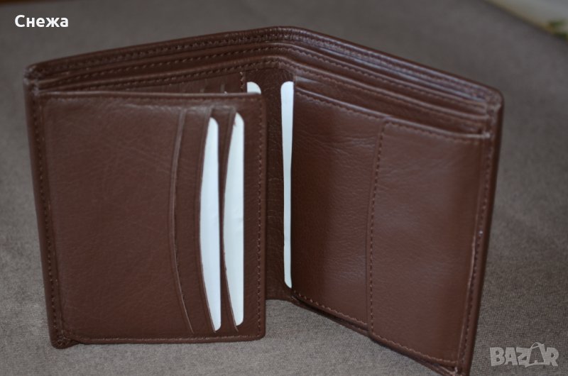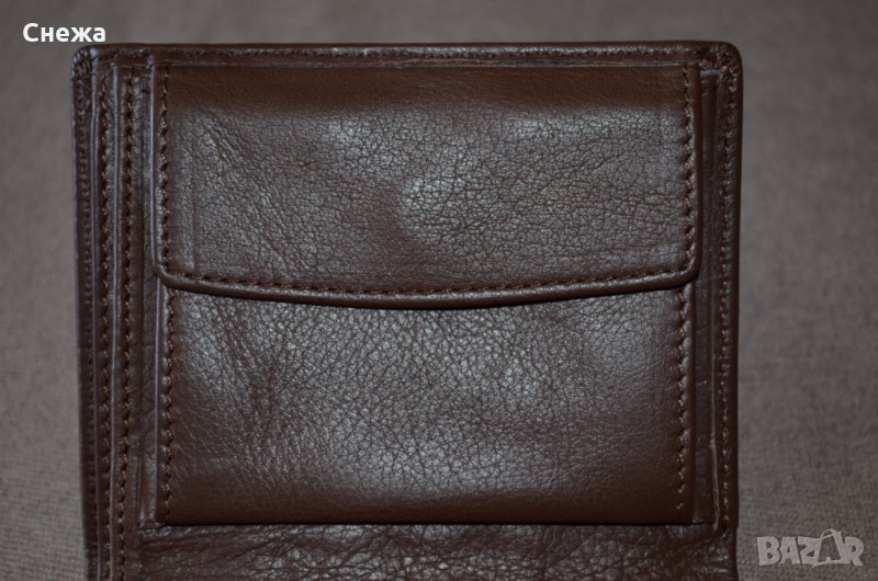 - 1 отделение за монети което се закопчава с копче. Надпис на фирмата отпред на портфейла.