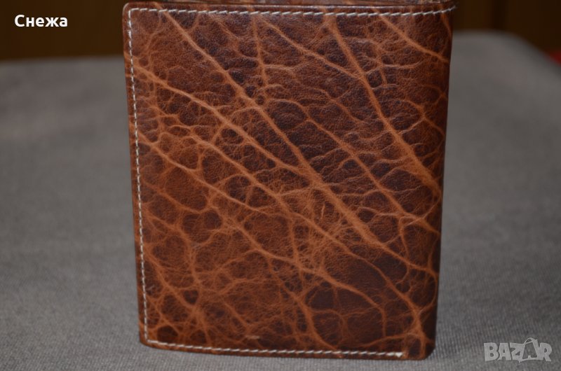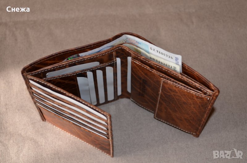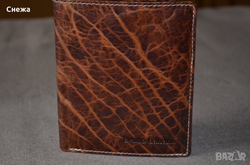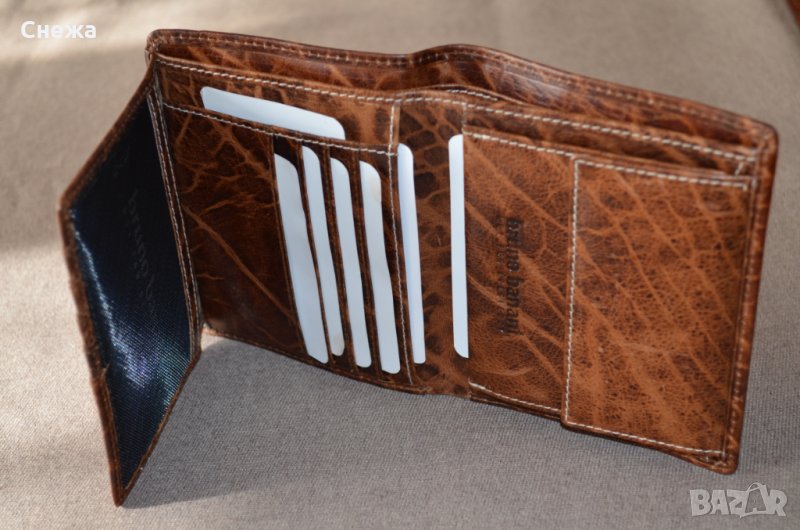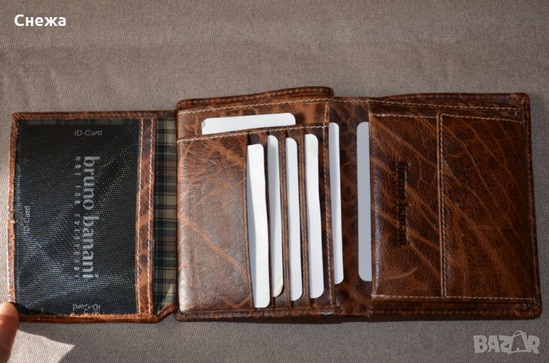 Портфейла е чисто нов и в оригиналната си кутия. Оригинален е на Германската фирма Bruno Banani, а номера на модела е W320/1837. Вертикален тип е. Изработен е от естествена кожа в цвят Коняк /по етикет Cognac/, подплата от полиестер от вътрешната страна. Портфейла разполага общо с множество от отделения или: