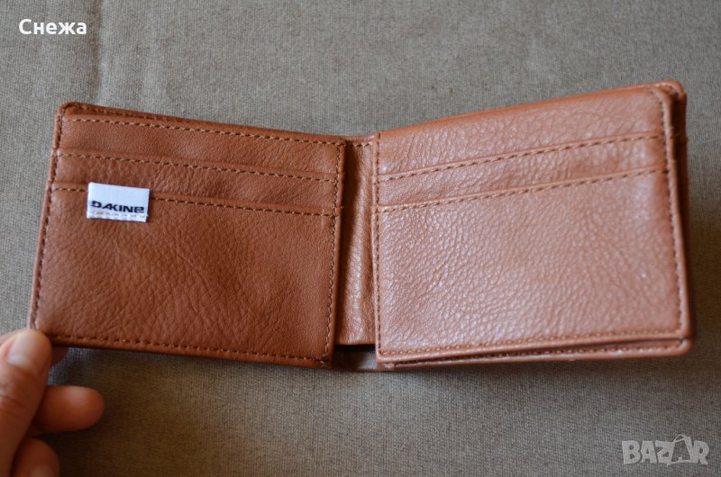 Портфейла е чисто нов с етикета и в оригиналната си найлонова торбичка. Оригинален е на фирмата DAKINE, а точния модел е AGENT Leather, актуален е и за повече инфо в интернет. Портфейла е изработен в комбинация от естествена и изкуствена кожа или: от външната страна е изработен изцяло от кафява естествена кожа, а от вътрешната страна е изработен от изкуствена кожа. Портфейла разполага общо с: