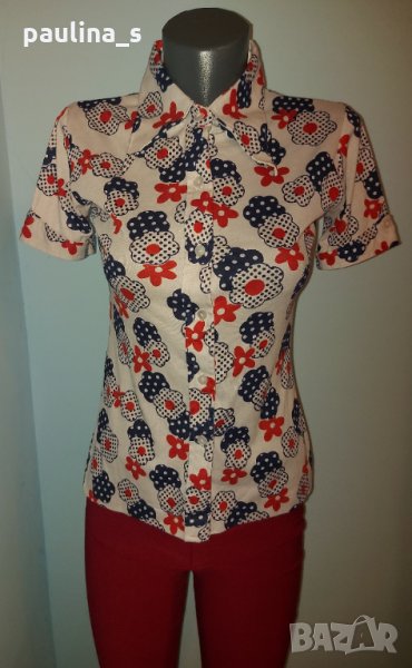 1️⃣ S / XL - Винтидж блузката е 100% памучно трико с еластичност във флорален принт, нова - цена 8,99лв. Цветът на принта е в Бордо.