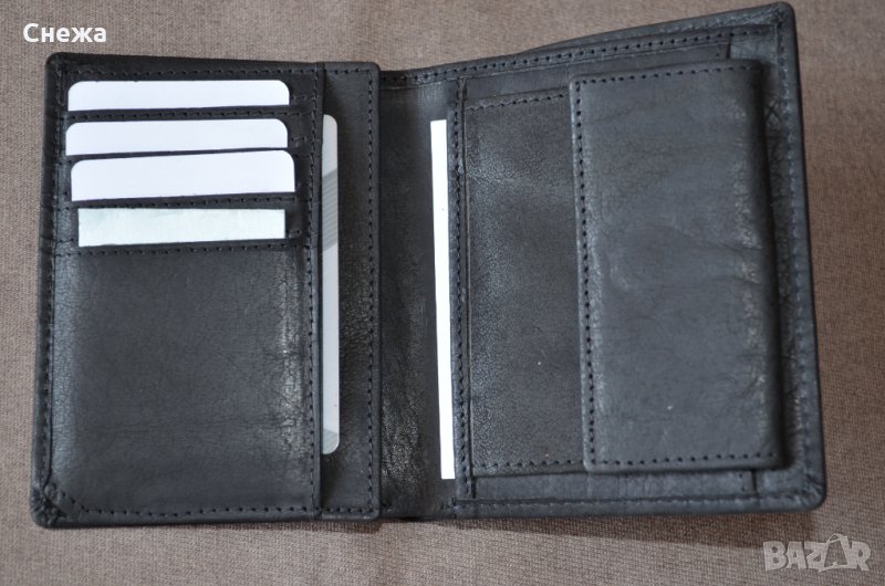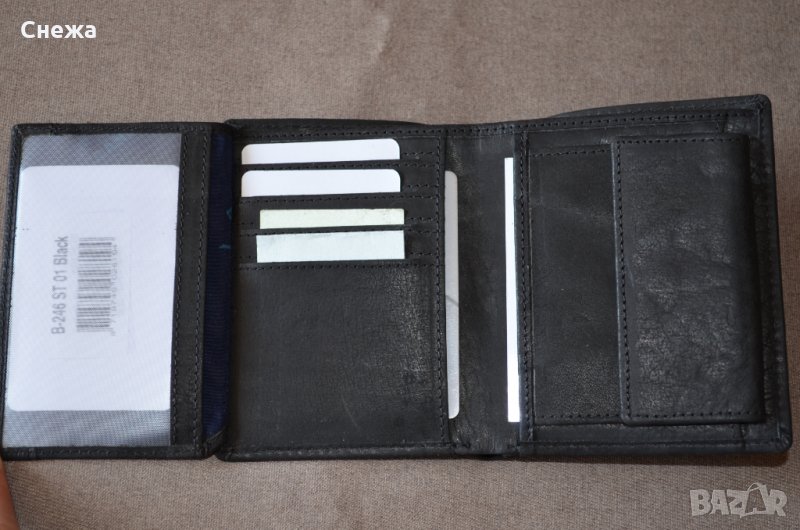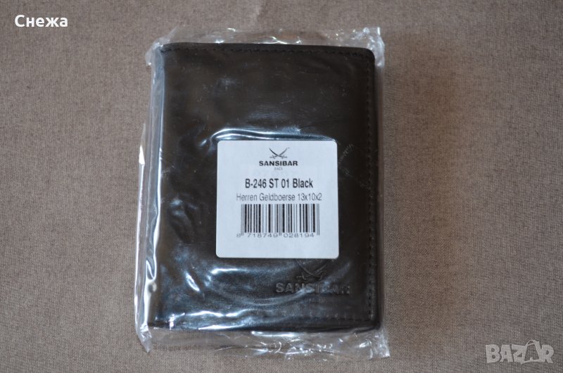 Портфейла е чисто нов и в оригиналната си найлонова опаковка. Оригинален е на Германската фирма Sansibar Bags и е с номер на модела B-246 ST. Вертикален тип и е изработен изцяло от черен матиран естествен набук. Портфейла разполага общо с: