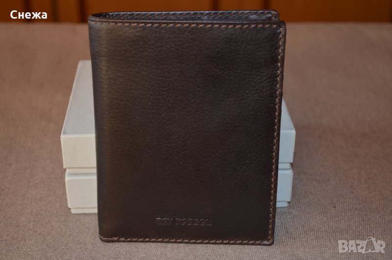 Портфейла е чисто нов и в оригиналната си кутия. На фирмата Roy Robson е и е от колекцията Colorado с номер на модела RR9-05. ВЕРТИКАЛЕН ТИП и е . Изработен е изцяло от естествена кожа в цвят по етикет MOCCA /тъмнокафяво/. Надпис на фирмата отпред на портфейла и малко лого от вътрешната страна. Портфейла разполага общо с: