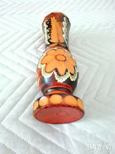 Чудесна ваза с дърворезба и декоративно рисувани елементи. Височина - 22,5 см. Диаметър горе - 7см.