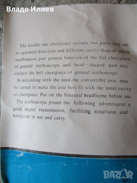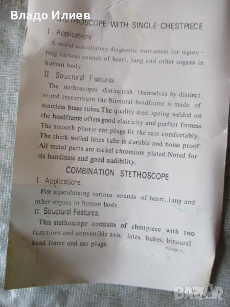 Уредът за измерване на кръвно налягане е от стар тип,но е съвсем нов,неизползван никога.Стетоскопът служи за прослушване на сърцето и белия дроб през гръдния кош.Включена е оригиналната му кутия и ръководство за експлоатация.Също абсолютно нов неупотребяван. Към уреда за измерване на кръвно налягане има и кожен калъф ,удостоверение за качество и инструкция/паспорт/ за употреба-вижте снимките.
