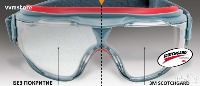 Повърхността на очилата е защитена с патентована технология 3M ™ Scotchgard ™ , която предпазва от замъгляване ( отвън и отвътре) в топли и влажни условия и надраскване. Тези защитни свойства се запазват през целия експлоатационен живот дори след многократно измиване и дезинфекция.