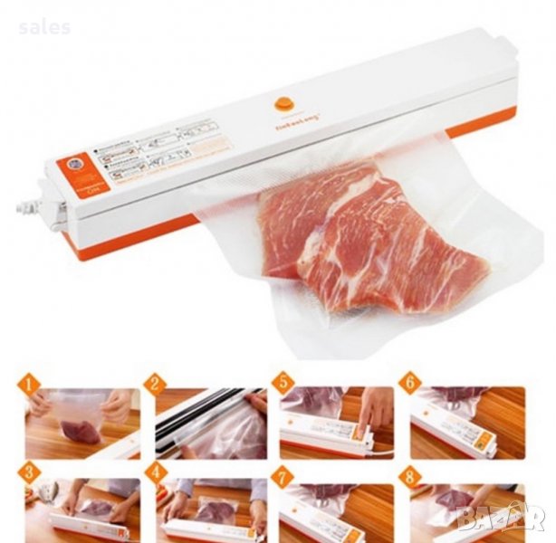 Създаден със специална технология, която изсмуква въздуха от пространството край желания продукт, уредът е изключително лесен за употреба. Поставяте продуктите в найлон, притискате с устройството и натискате бутона за включване, въздухът край продуктите изчезва и всичко е херметическо затворено. Без опасност от овлажняване и бързо разваляне на продуктите, без смесване на миризми и компактно съхранение в хладилника.