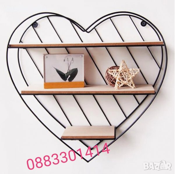 Декоративна композиция с 3 рафта във формата на сърце, с метална мрежа на гърба. Той не се нуждае от монтаж, инсталира се лесно с 2 винта и дюбели (включени).