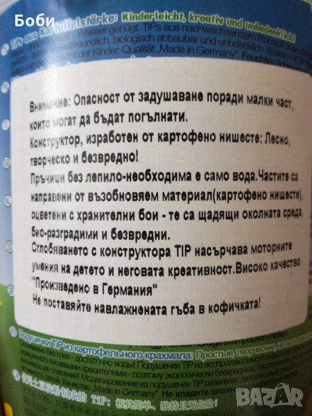 Страхотен конструктор,направен от картофено нишесте.Напълно безвреден.За деца над 3 години.Нов,неразпечатван.Произведен в Германия.