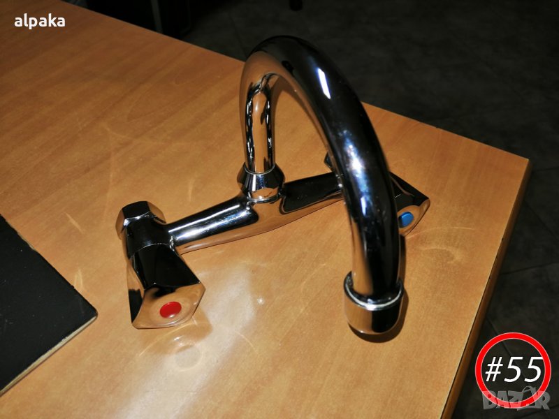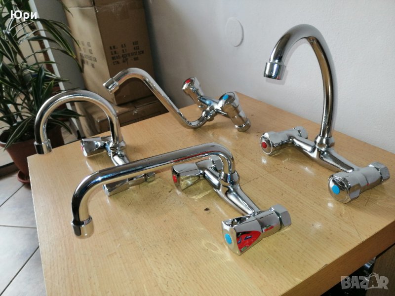 Снимка 401. Кухненска стенна батерия с горна лебедка тип "жираф", , "У лебедка", "S-лебедка", спластмасови ръкохватки, стандартни ,каучукови затварящи механизми, аератор Перлатор, осово разстояние - НА 150ММ - ЦЕНА 22 €