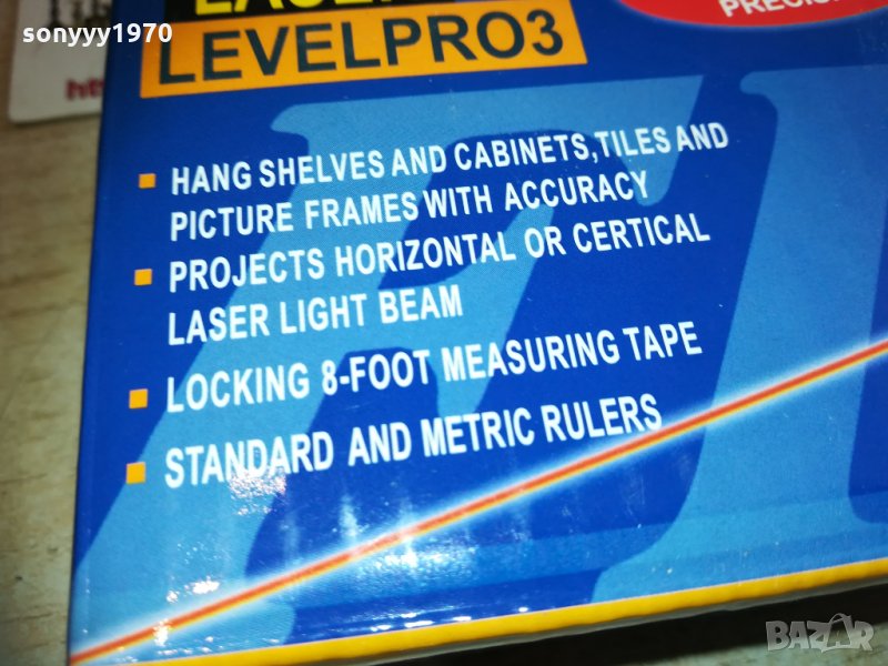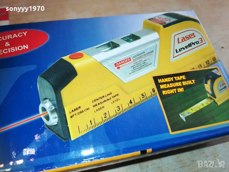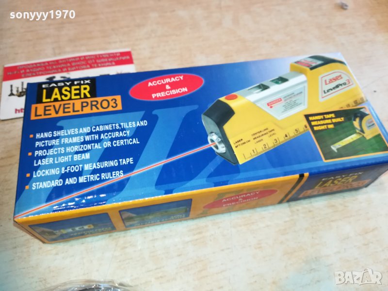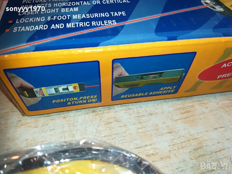Лазерен нивелир с ролетка с възможност за нивелиране и фиксиране на прав ъгъл - видим до 2.5 м в закрито помещение. Ролетката е със стопер, механизъм за бързо връщане и Г-образна пластинка за захващане при измерване. Удобен инструмент за довършителни ремонтни дейности, фаянс и теракот, за монтаж на кухненски шкафове, на картини и рамки. Захранване с 2 броя батерии ААА, които не са включени в комплекта. Предлага се в картонена кутия. Размери: 16х6х2.5 см.пращаме със спиди или еконт с преглед и тест след превод на капаро за куриерската услуга поради зачестили некоректни потребители-поръчки само тук в саита! по телефона и със смс не! краини цени! бартери не правиме! ПАРИ НЕ ВРЪЩАМЕ! всеки ден нови неща-още 2-3 наши обяви тук