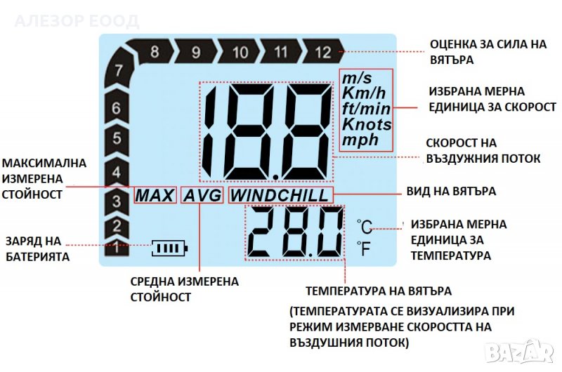 Дигитален анеометър – ветромер. Може да бъде използван за замерване температура и скорост на въздушен поток при профилактика и проверка състояние на климатични системи, вентилационни отвори, измервания на въздушен поток на сушилни, оранжерии, тегловна сила на комини и други.