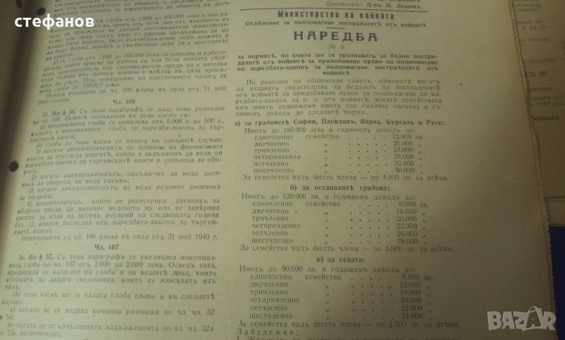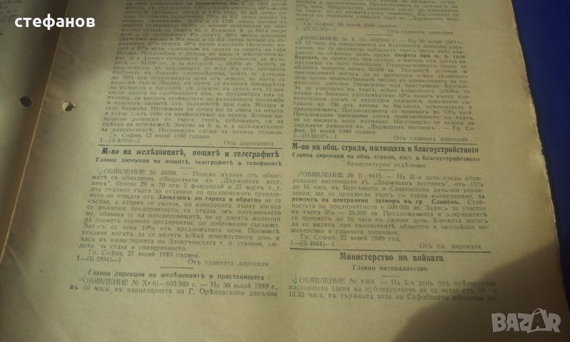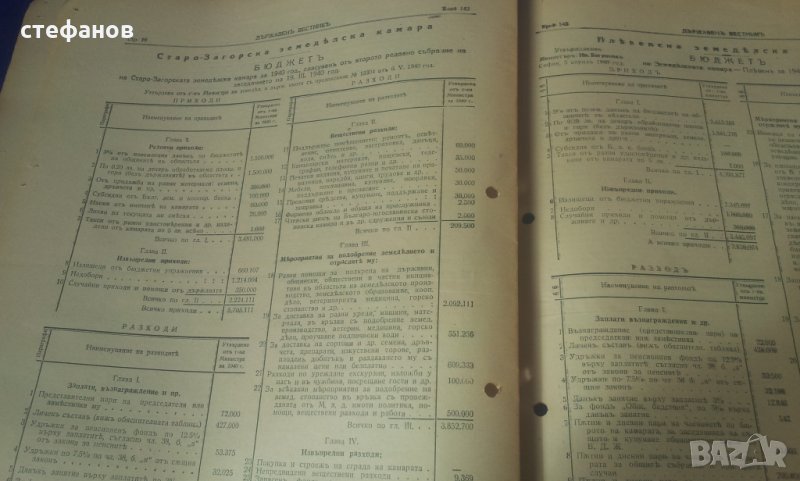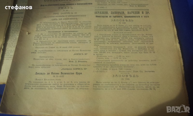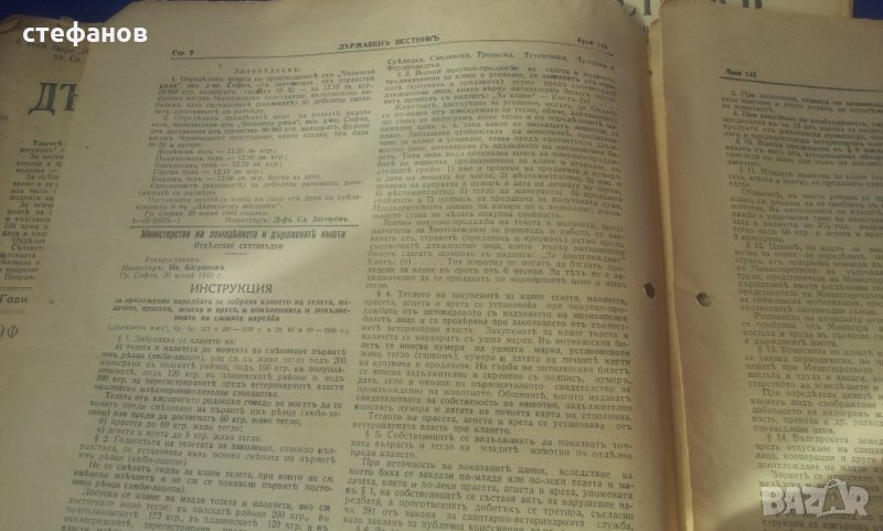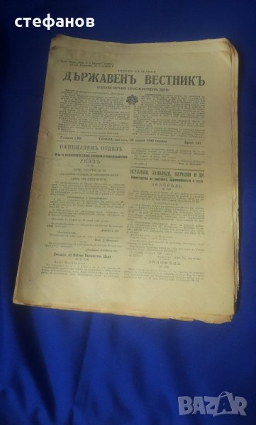 Моля да зачетете внимателно текста към обявата, защото в него е обяснено подробно. На въпроси отговарям тук на съобщение от Вас. Активна ли е обявата може направо да си поръчате харесаното. Държавните вестници са в много добро състояние, като няма скъсано, липсващи страници, мухъл, миризма или нещо правещи ги неприятни вещи. В държавния вестник, както и сега се публикуват и влизат в сила царски заповеди, реформи, назначения, уволнения на министри. Курс лев към други валути. Тогава лева е бил изключително силен. Всяко едно е частица от историята на България по онова време при цар Борис III и Богдан Филов. Цената от 4 лв е за брой и цената е символична. Имам 10 броя и при закупуването на всички, цената е 3 лв/бр или 30 общо. Изпращам добре опаковано по Еконт с опция преглед преди да се плати. Куриерската услуга е за сметка на купувача, но подготвям товарителницата през Базарбг и по тази причина имате отстъпка от 10% от нея. Изпращам само на регистрирани в сайта потребители и след като тук на съобщение имам две имена, телефон за връзка и до кой офис на Еконт или до точен адрес да пътуват. Моля да пишете “името” на офиса на еконт, а не улицата на която се намира. Така ще избегнем изпращане към друг офис! НЕ ИЗПРАЩАМ ПО СПИДИ!!! Поради евентуални некоректни се обаждам по телефона за потвърждение на поръчката. 150сте.