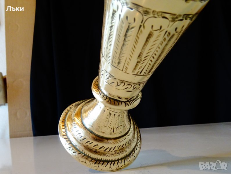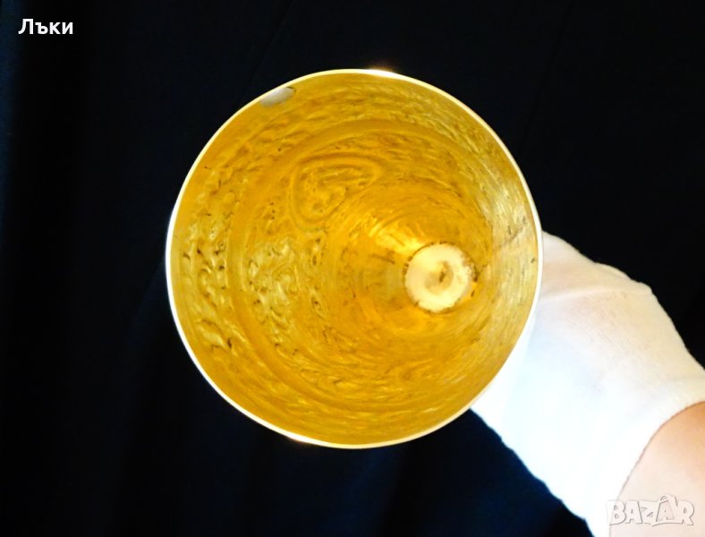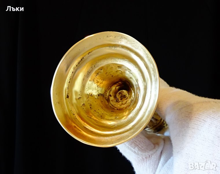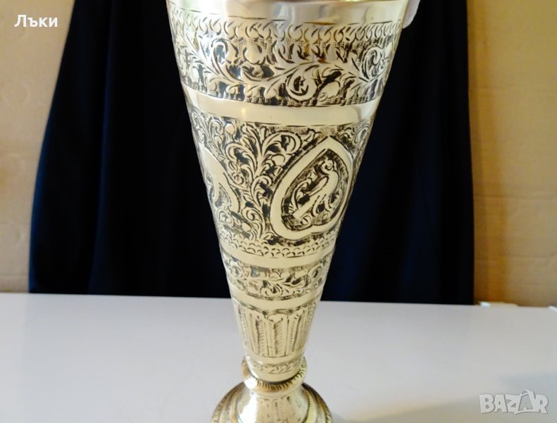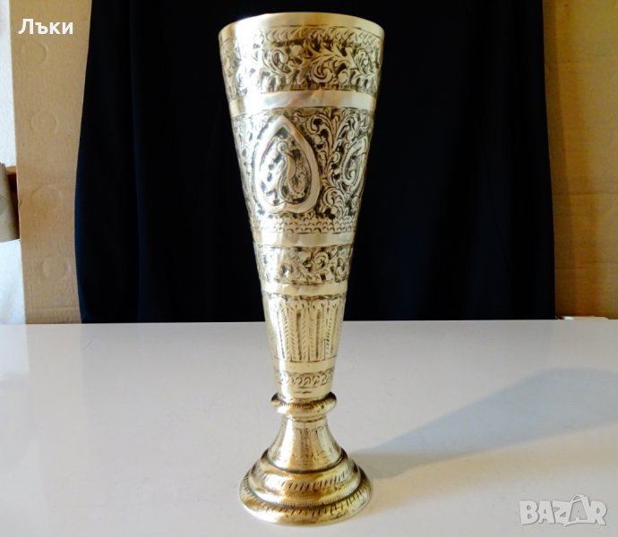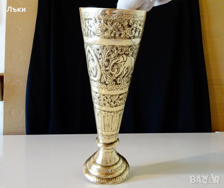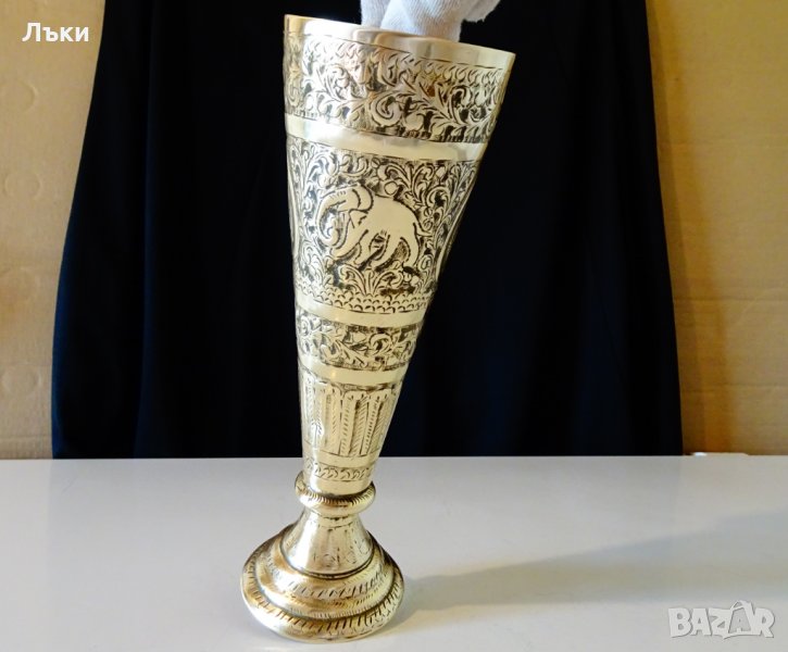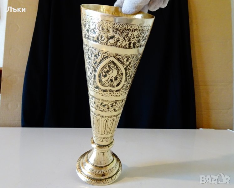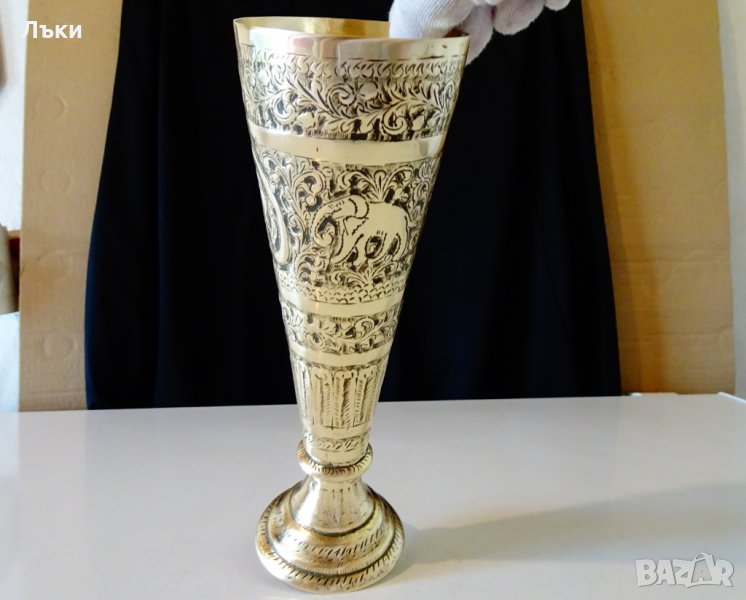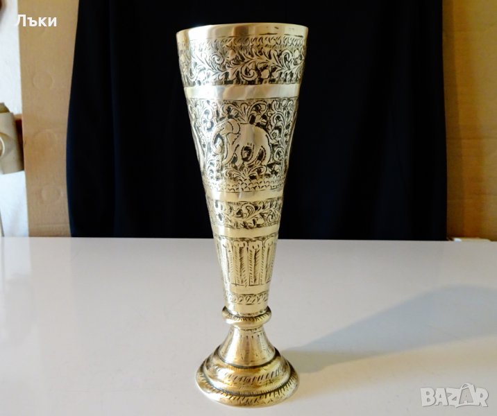 Много старинен,със сигурност бокал от древността,изработен преди над 500 години от бронз в Индия.Кован на ръка с релефни изображения на Слон и Паун,сред множество флорални мотиви,символи и орнаменти.Незнайно как оцелял до наши дни,дошъл от далечни земи, от времето на легендите за велики царе и красиви царици.Кой ли владетел е отпивал червено вино след славна битка,в чии ли нежни ръце е носил радост и възхита? Едно е сигурно,този бокал носи история,буди преклонение и ще разказва още и още на много поколения.Височина 23 см.,диаметър 8 см.,тегло 430 гр.Вместимост 500 мл.