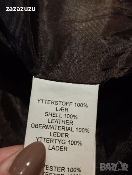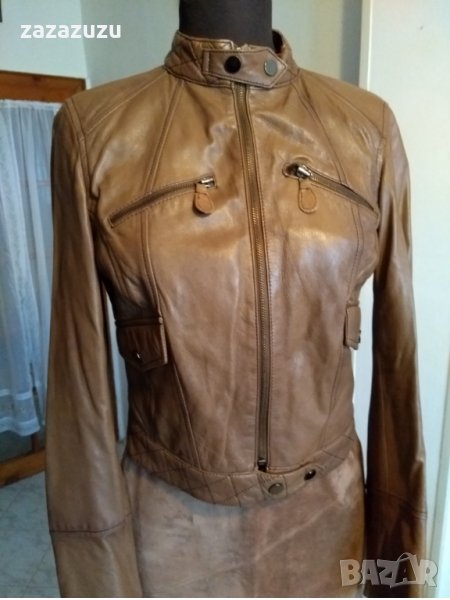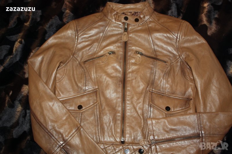 ЕСТЕСТВЕНА КОЖА цвят карамел, агрешка напа, много мека, два външни джоба, прави ръкави с цип в китката. Дължина от тила до долу 44см., ръкав 63см., гръб от рамо до рамо 37см., гръдна обиколка 96см., обиколка най-долу 86см.