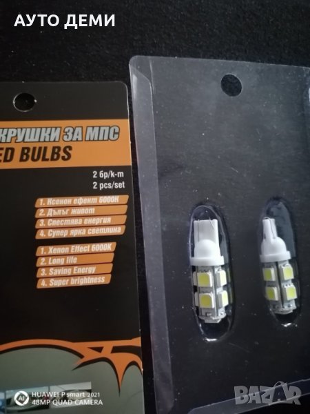 Цена за един комплект от два броя Т10 ЛЕД крушки светещи в бяла светлина в оригинална опаковка - 3.60 лв.