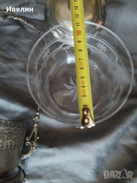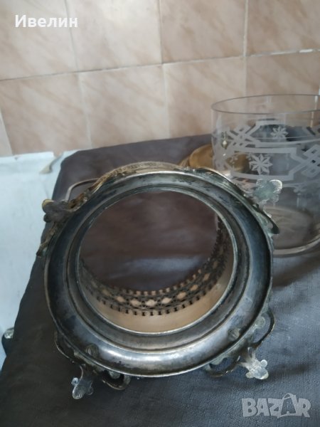 стара посребрена захарница арт деко.месингов корпус,налична маркировка.стъклен съд,ръчно гравиран с обем около 1,2литра.