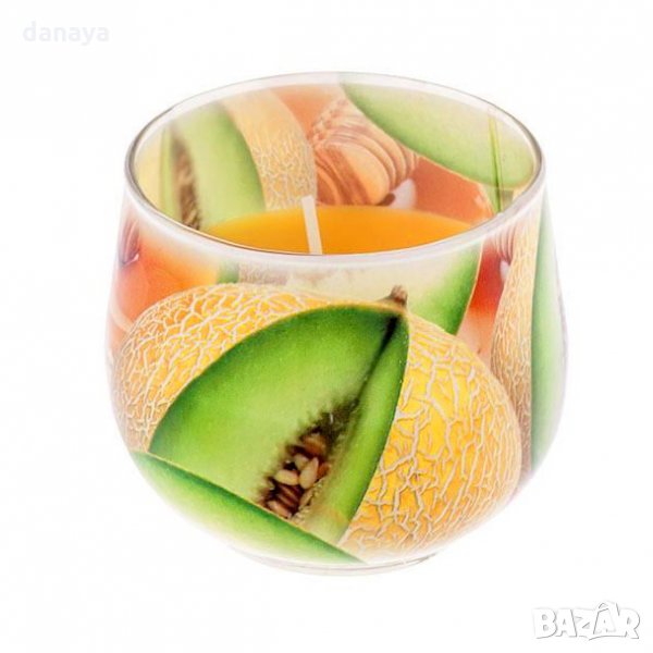 Ароматизирана свещ в чаша с принт на ароматите, които отделя – пъпеш и мед. Чудесна декорация за трапезната маса или просто красиво допълнение към скрина у дома или офиса. Подходяща е и за подарък.