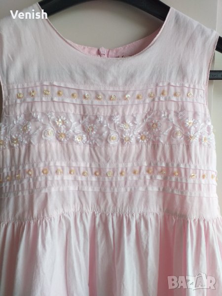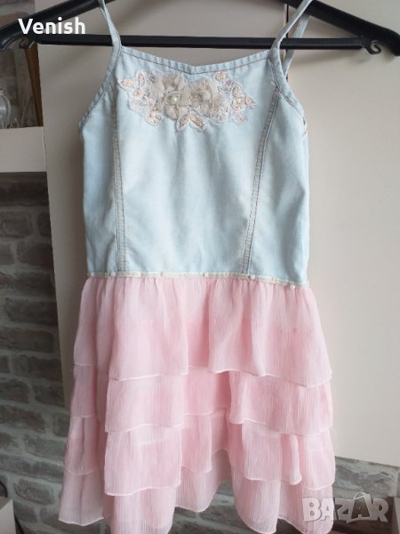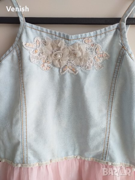 Нови рокли, едната в горната част е с дънков плат .И двете са с бродерия с перли и пайети. За 8-9 годишно дете.