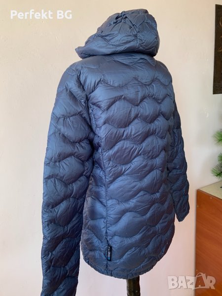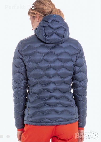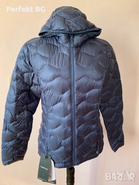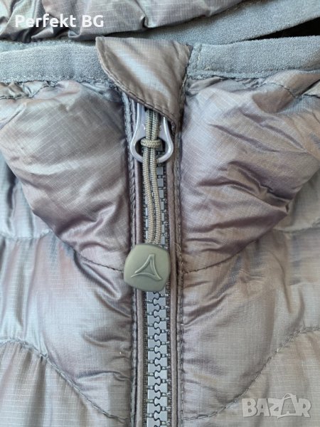 Пухено дамско яке с качулка , направено от водоотблъскващата материя с пълнеж от пух.