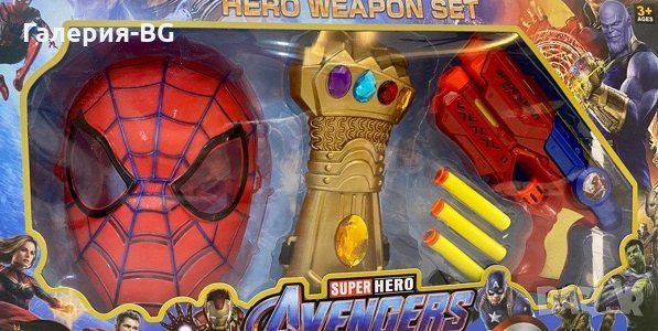 Комплекта включва: Маска на Хълк, пистолет с меки куршуми тип нърф - (Nerf) и ръката на Танос.