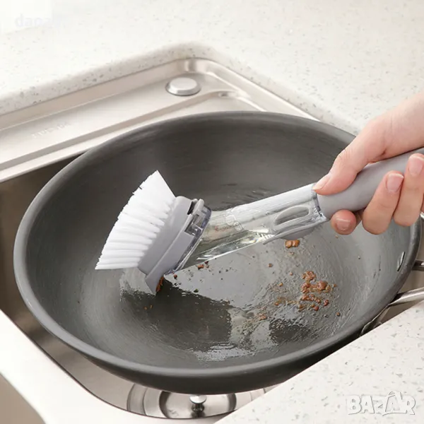 Четка за миене на съдове с диспенсър за веро или друг препарат. Удобна и практична четка с вграден диспенър за препарат. Идеална е за миене на съдове, плотове и различни повърхности. Чудесен инструмент за измиване на съдове, с помощта на вградената шпатула, лесно ще почистите силно замърсени повърхности и упорити петна.