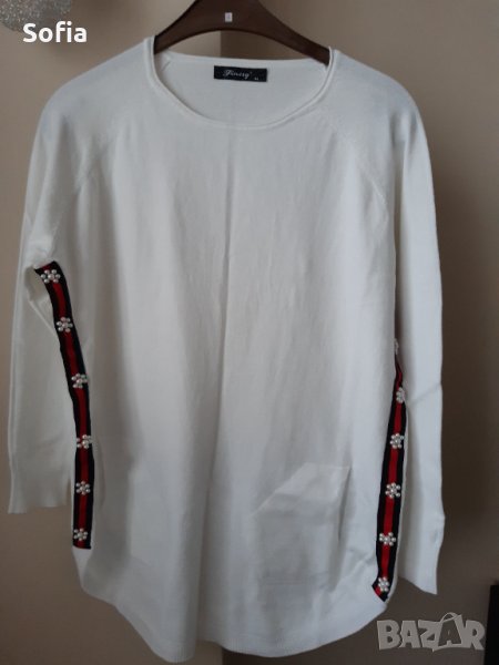 Финно снежно бяло свободно леко пуловерче с декоративни ширити+перли.Покрива ханша.Дължина от гръб център:73см,красив завършек,кантове и декорации.Финно и меко.