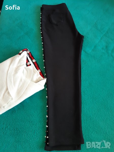 И спортно-елегантен панталон с декоративни перли-кант.Широк ластик колан,права кройка.Дължина:92.5см с колана,колан-5.5см,ластик свободен доста,талия паднала:38см.Еластичен плътен плат. отзад 2 малки джобчета.